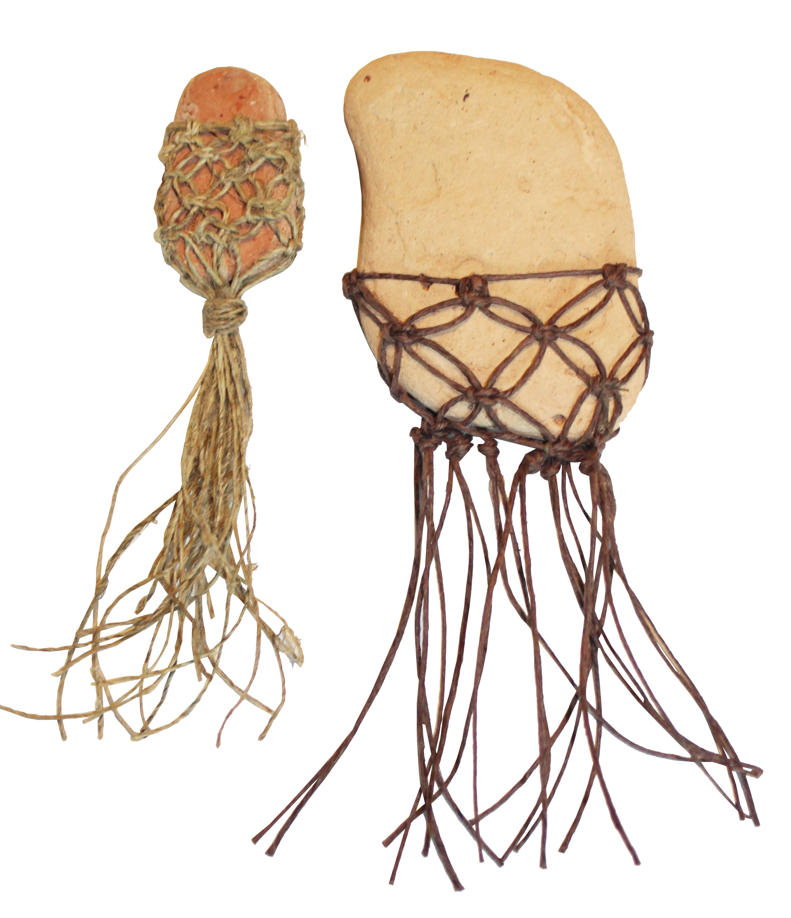 Using four strands from two neighboring knots, complete a square knot as before. Continue around the rock using strands from two neighboring knots, until the rock is covered with knots.
