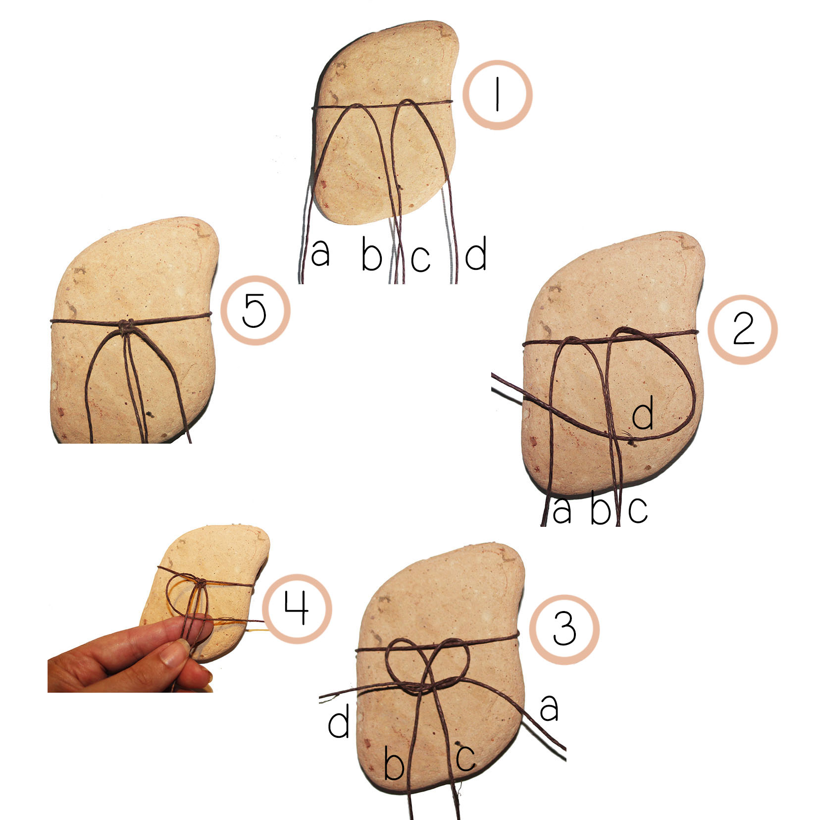1. Tie a “belt” around the stone. Then loop 2 pieces of hemp over the belt, making a total of 4 strands hanging down.