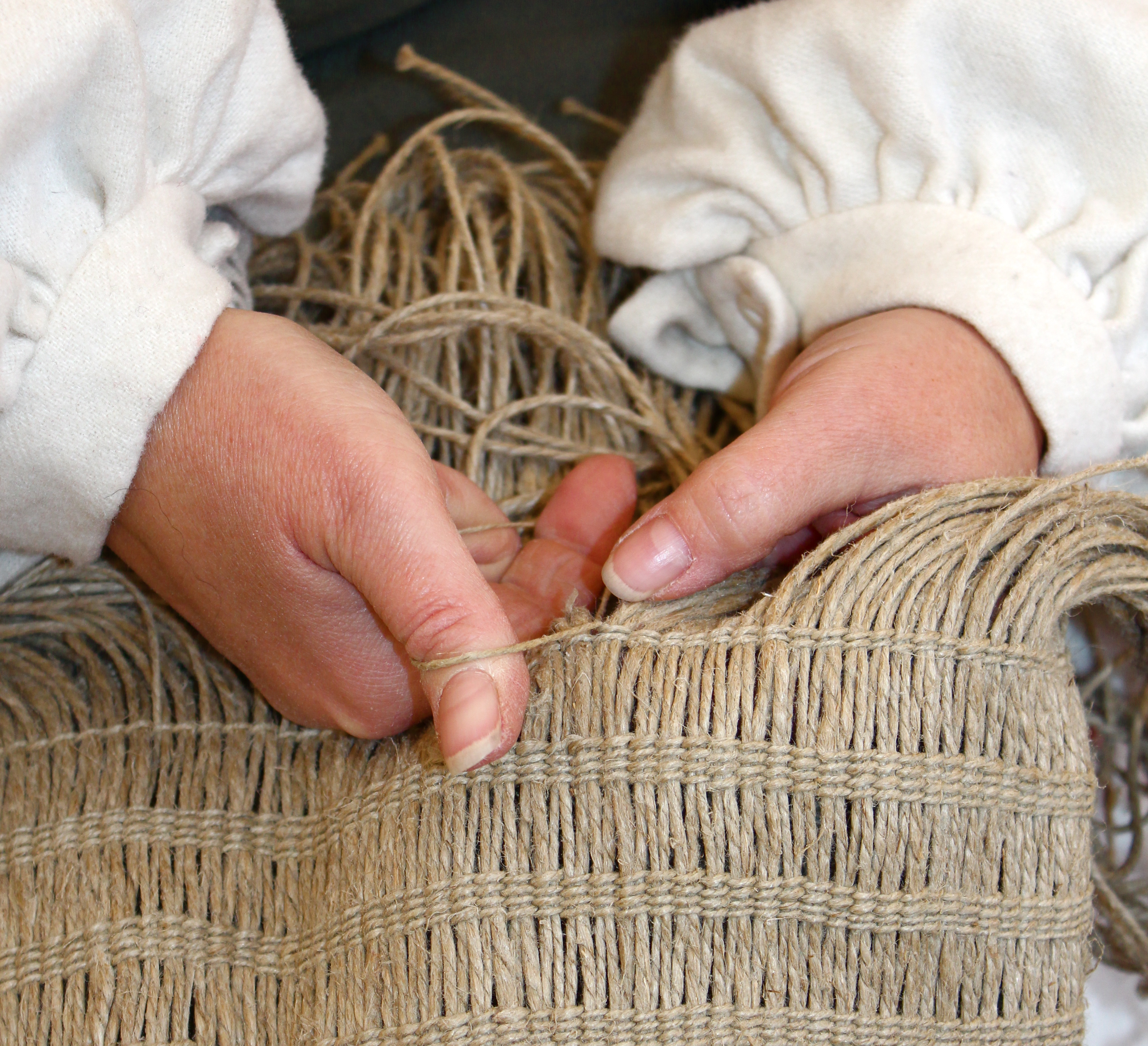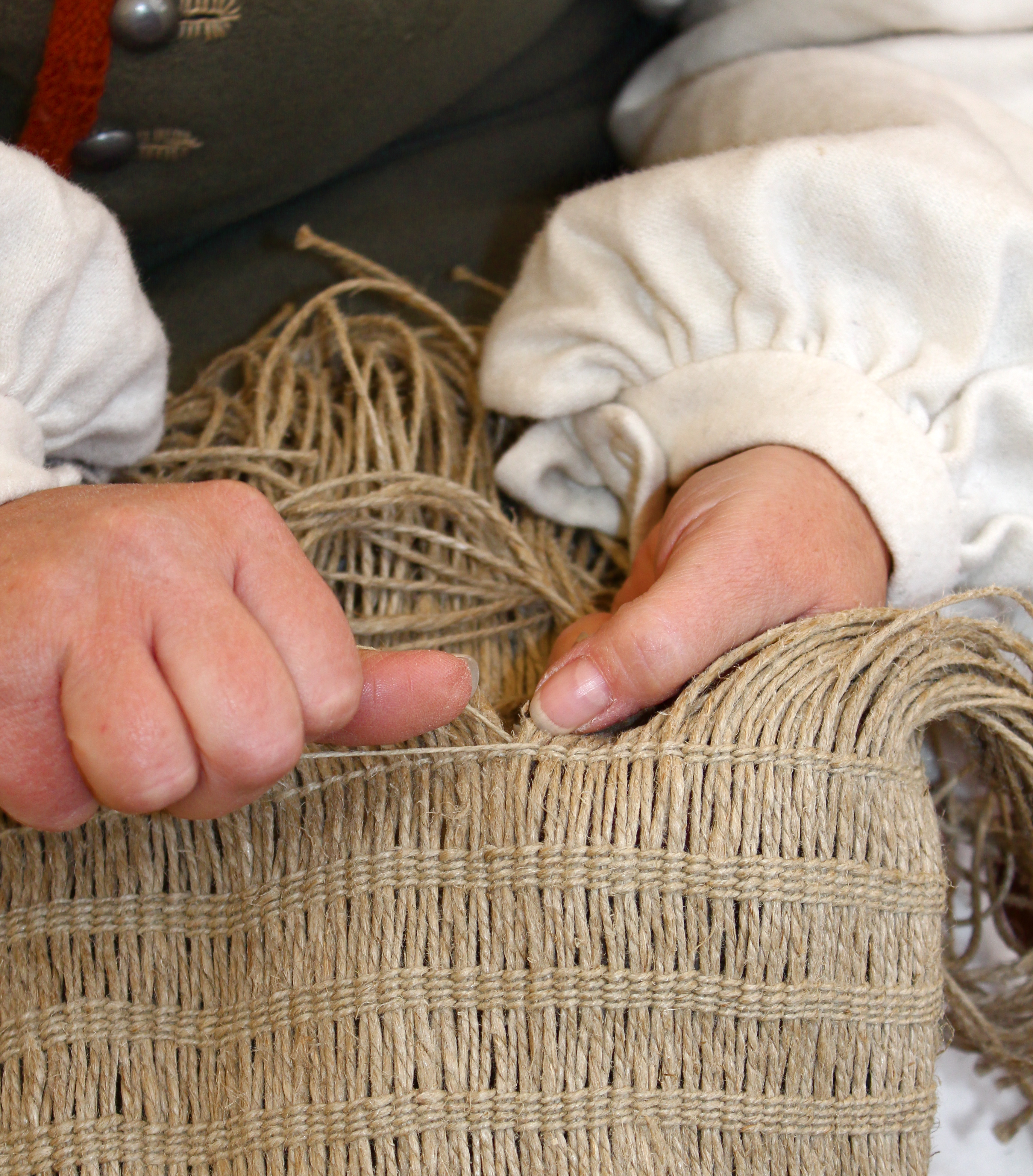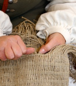 I was introduced to the skill of twining this fall at a historical reenactment. A woman was making a bag & was kind enough to show me how she was making it.