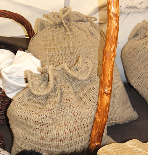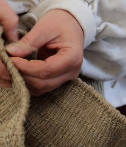 She continued to work the weft in this way until she had gone around the bag several times. Then, she would create a gap & start again an inch or so farther down. I really like the look of these bags that she was making & think they would be great market bags. They look to be very strong & durable.